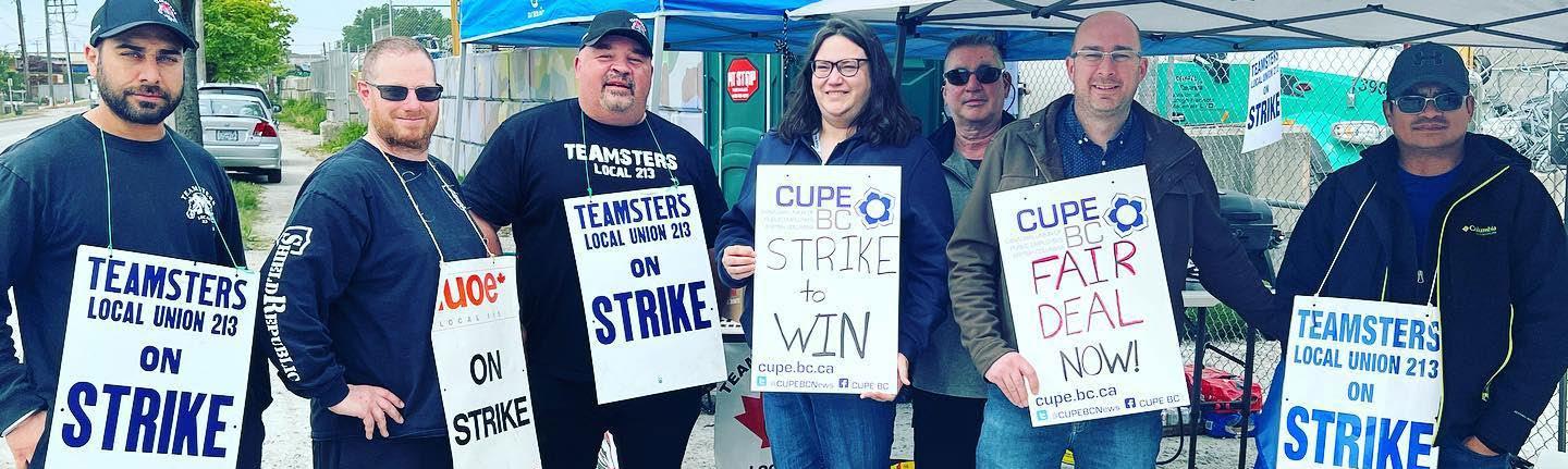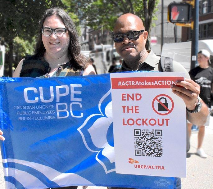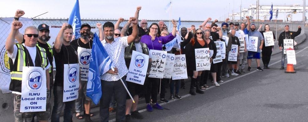 ON THE LINE From top, CUPE members showed solidarity with striking members of IOUE 115 and Teamsters 213 on Mitchell Island in Richmond on May 26; locked out ACTRA members in a direct-action rally on July 11 in Vancouver (above); striking BCGEU members in Kamloops on August 19; and Local 502 of the International Longshore and Warehouse Union (ILWU) in Delta on October 2.