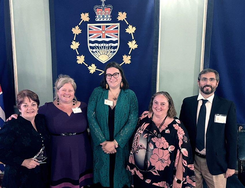 SERVICE For this year’s Premier’s Awards for Excellence in Education, the winner for education assistants was CUPE 801 member Elaine Tattrie, who has served as an EA on the Sunshine Coast for 20 years and with School District 46 even longer. Congratulating Elaine (left) at the Oct 14 ceremony were CUPE Education coordinators Kirsten Daub and Justin Schmid (second left, far right), CUPE BC President Karen Ranalletta, and CUPE 801 past secretary-treasurer Liana Leskie.
