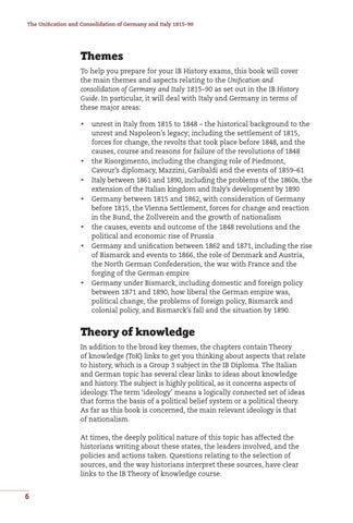 Themes To help you prepare for your IB History exams, this book will cover the main themes and aspects relating to the Unification and consolidation of Germany and Italy 1815–90 as set out in the IB History Guide. In particular, it will deal with Italy and Germany in terms of these major areas: