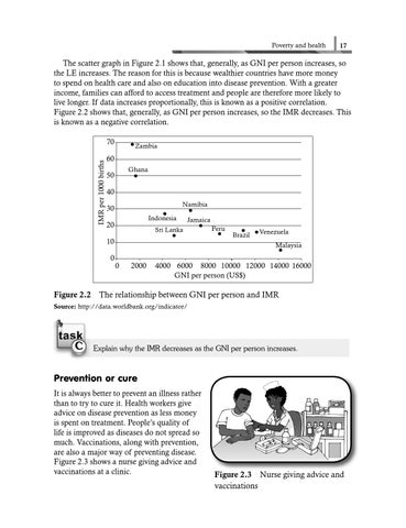 The scatter graph in Figure 2.1 shows that, generally, as GNI per person increases, so the LE increases. The reason for this is because wealthier countries have more money to spend on health care and also on education into disease prevention. With a greater income, families can afford to access treatment and people are therefore more likely to live longer. If data increases proportionally, this is known as a positive correlation. Figure 2.2 shows that, generally, as GNI per person increases, so the IMR decreases. This is known as a negative correlation.