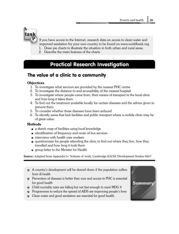 Practical Research Investigation The value of a clinic to a community Objectives 1. To investigate what services are provided by the nearest PHC centre 2. To investigate the distance to and accessibility of the nearest hospital 3. To investigate where people come from, their means of transport to the local clinic and how long it takes them 4. To find out the treatment available locally for certain diseases and the advice given to prevent them 5. To consider whether these diseases have been reduced 6. To identify areas that lack facilities and public transport where a mobile clinic may be of great value. Methods a sketch map of facilities using local knowledge identification of frequency and route of bus services interviews with health care workers questionnaire for people attending the clinic to find out where they live, how they travelled and how long it took them group letter to the Minister for Health Source: Adapted from Appendix to ‘Scheme of work, Cambridge IGCSE Development Studies 0453’