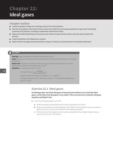 Exercise 22.1 Ideal gases An ideal gas does not exist! But gases at low pressures behave very much like ideal gases, so the idea of an ideal gas is very useful. This is an exercise in using the ideal gas equation and Boyle’s law. 1 This is the ideal gas equation: pV = nRT. a State the quantity represented by each symbol, giving the unit of each. b Which two quantities are related by Boyle’s law? State the two quantities that are constant in Boyle’s law. If you are not sure, look back at the ideal gas equation. c Which quantity in the equation can be used to calculate the mass of gas? Explain how you would carry out such a calculation.