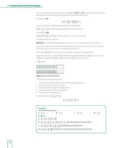 Try Example 2(a) (iv) yourself. Warning: This only works for multiplication, so do not use it in addition or subtraction! How can we visualise division? Remember that if you do the division 10 ÷ 2 you are finding how many twos there are in ten. The answer of course is 5. Think about 43 ÷ 81 . This means ‘how many eighths are there in three quarters?’ Figure 2.13 shows one strip with 43 shaded, and another divided into eight equal parts and shaded to show that 6 eighths will go exactly into 43 . So the answer is 6. i.e. 43 ÷ 81 = 6 1 4 1 8