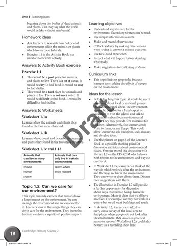 Before teaching this topic, it would be worth enquiring about local or national groups that are concerned about the environment. It may be possible for a local expert or volunteer to visit the school and talk to the learners about local environmental issues. They may provide free materials for children. Alternatively, the learners could write to them, or use Skype. This would allow learners to ask questions, seek answers and develop ideas. Use the picture on page 8 of the Learner’s Book as a possible starting point for discussion and ideas about environmental issues. You can extend the discussion with Picture 1.2 on the CD-ROM which shows both threats to the environment and ways to care for it. In Worksheet 1.2a, learners can think of the ways in which we look after the environment and the ways we harm the environment. They can write or draw about them. Discuss their suggestions with them. The illustration in Exercise 1.2 will provide a further opportunity for discussion about ways that human beings harm the environment. Make it clear that we all have an effect. For example, we may not work in a quarry but we all want buildings and roads. In Activity 1.2, learners are asked to carry out a survey of the local area to find places where people do not look after the environment. (See Notes on practical activities section.) Worksheet 1.2a could also be used as a recording sheet here.