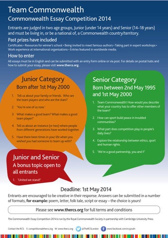 Team Commonwealth Commonwealth Essay Competition 2014 Entrants are judged in two age groups, Junior (under 14 years) and Senior (14–18 years) and must be living in, or be a national of, a Commonwealth country/territory.