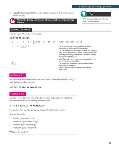 ACTIVITY 5.7 Use the binary search algorithm to find the number 21 in the following list using a table as in the worked example. 3 15 21 27 33 39 42 48 56 60 66 67 69
