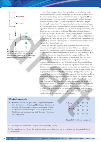 Now, if the charge q feels a force according to one observer, other observers must reach similar conclusions. So the puzzle is: where does the force on the charge q come from? Notice that in Figure A.8b we made the distance between positive charges smaller and the distance between electrons larger. This has to be the case if Lorentz is right about length contraction. The separation between the positive charges is a distance that moves past the observer and so has to get smaller. The separation between the electrons used to be a ‘moving’ distance so, now that it has stopped, it has to be bigger. The effect of this is that now, as far as the charge q is concerned, there is more positive charge than negative charge in the wire near it. There will then be an electric force of repulsion. We have learned that, as a result of length contraction, the force that an observer calls magnetic in one reference frame may be an electric force in another frame. There are many such puzzles which can only be resolved if the phenomena of length contraction and time dilation are taken into account. So consider two positive charges that move parallel to each other with speed v relative to the black frame (the lab); see Figure A.9a. For an observer moving along with the charges (red frame) the charges are at rest and so there cannot be a magnetic force between them. There is, however, an electric force of repulsion. For this observer, the charges move away from each other along straight lines. For an observer at rest in the lab there are repulsive electric forces but there are also magnetic forces; this is because each moving charge creates a magnetic field and the other charge moves in that magnetic field. The magnetic field created by the bottom charge at the position of the top charge is directed out of the page. The magnetic force on the top charge is therefore directed opposite to the electric force; the magnetic force is attractive. The net force is still repulsive and the two charges move away from each other along curved paths. Examining the details of this situation shows that the two observers will reach consistent results only if time runs differently in the two different frames. This is more evidence that, to avoid these electromagnetic puzzles, ideas similar to Lorentz’s must be true; it is not a surprise that Einstein’s 1905 paper is entitled On the Electrodynamics of Moving Bodies.