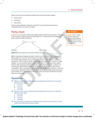 Before transmission begins, the parity check is set to be either odd or even parity. The number of 1s in the 7 bits of data are totalled. In the example in Figure 2.11, the result of that would be 2. If an odd parity check is used, then a 1 is added as a parity bit. This is because all the 1s in the byte now add up to 3, which is an odd number. If an even parity check is used a parity bit of 0 would have been added instead. This is because all the 1s in the byte would then add up to 2, which is an even number. When the parity bit has been added to each byte, the data can be transmitted. After transmission, the receiving device will check each byte of data for errors. If an odd parity check has been used and the device finds a byte that has an even number of 1s, then it knows that an error has occurred with this byte of data. The error is detected!