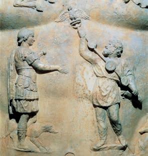 The principia also included a small temple (sacellum ), which housed the aquila , the legion’s battle standard. The aquila was an image of an eagle perched with outspread wings on the top of a pole. It was made of gold and in its talons it clutched a bundle of golden darts that represented the thunderbolts of Jupiter.