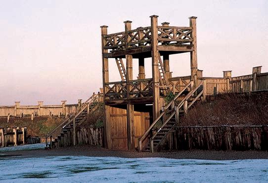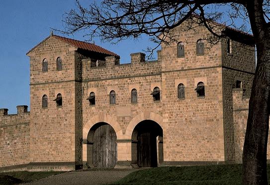 The left picture shows a reconstruction of a wooden gate at a fort in central England (seen from the inside). Right is a reconstructed stone gateway at a fortress used as a supply base for Hadrian’s Wall.