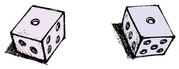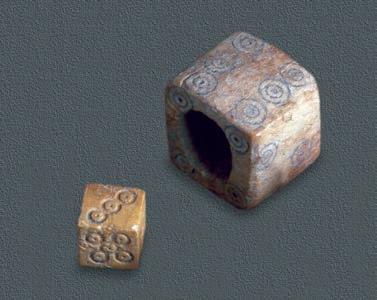 The Romans were very fond of games involving types of dice, both the kind we are used to (left), and more novel varieties such as the little man (right), who can fall six ways up; here he scores 2. The larger of the cubic dice has a hollow in it, possibly for loading the dice.