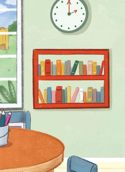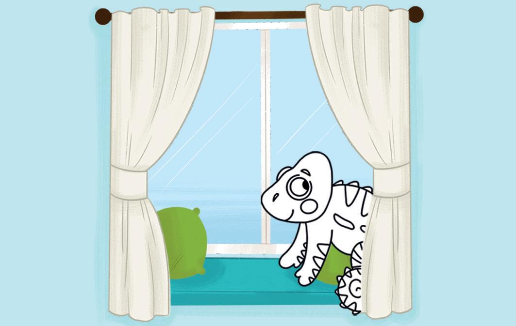 • Point out the labels for ‘window’, ‘table’, ‘chair’, ‘board’, and ‘shelf’. Draw children’s attention to the object within the picture that each label is referring to. Gesture to objects around your classroom setting to reinforce the vocabulary.