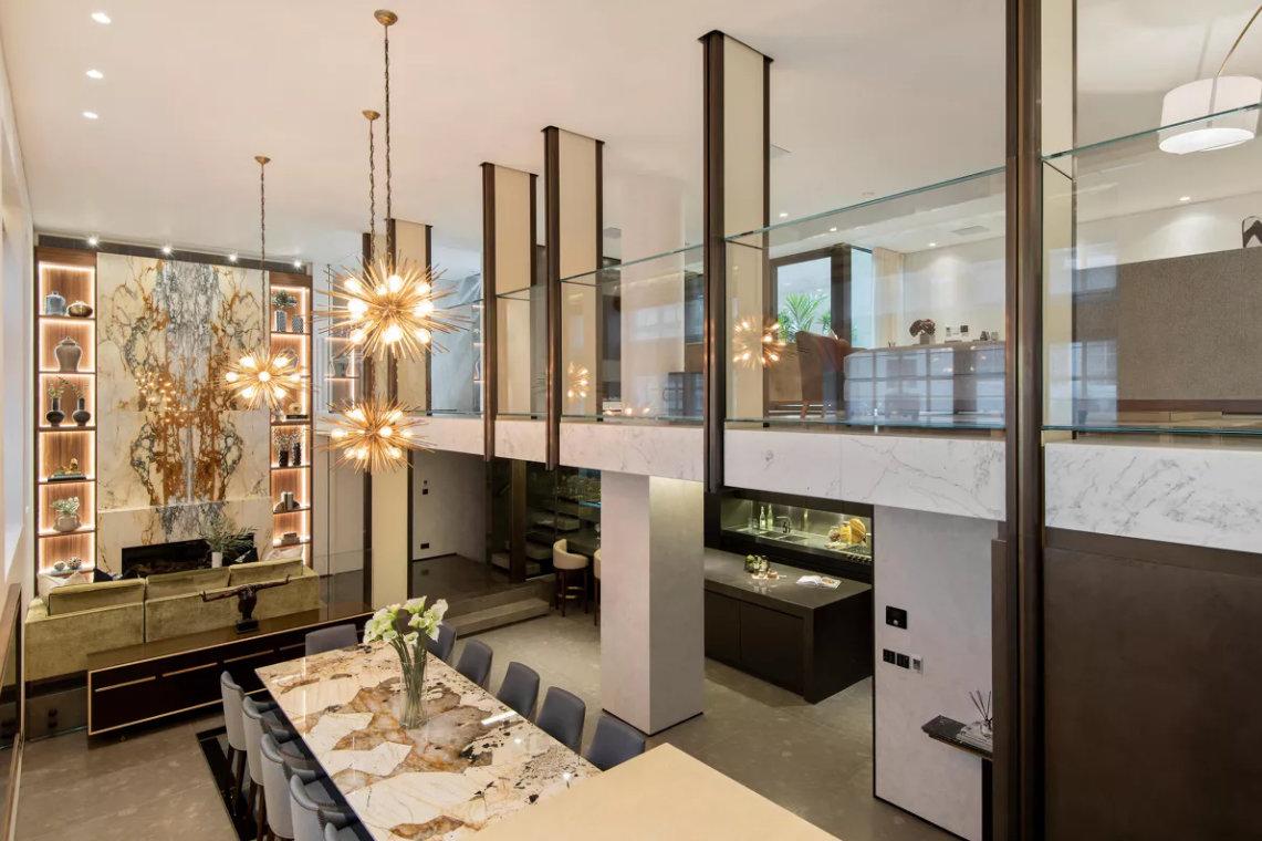 Upon entering the house at ground level, one is met with a breathtaking double height living and dining space. The dining area has a ceiling height of 5.5 metres, with a full height marble fire-place feature wall towering over the ground floor reception room area.