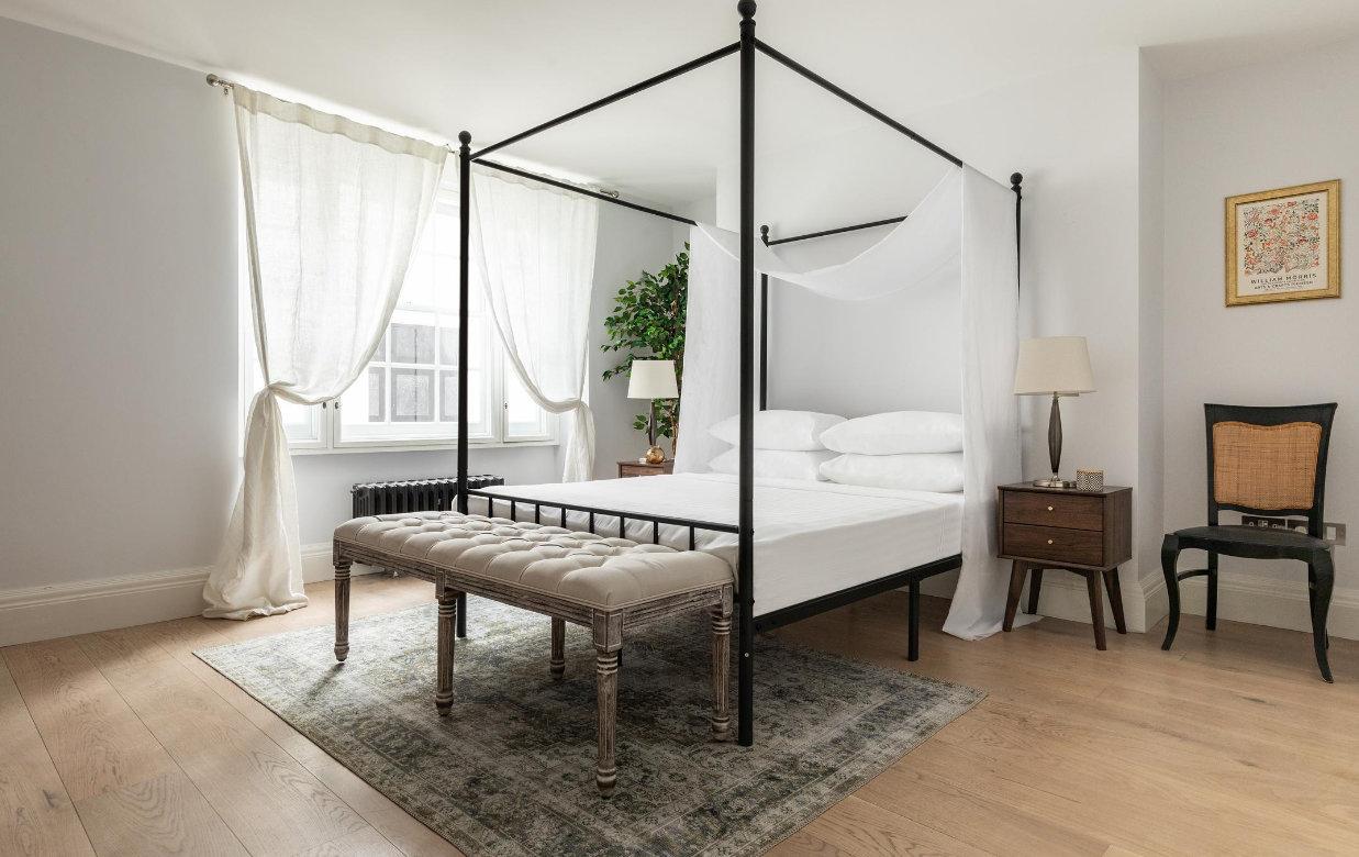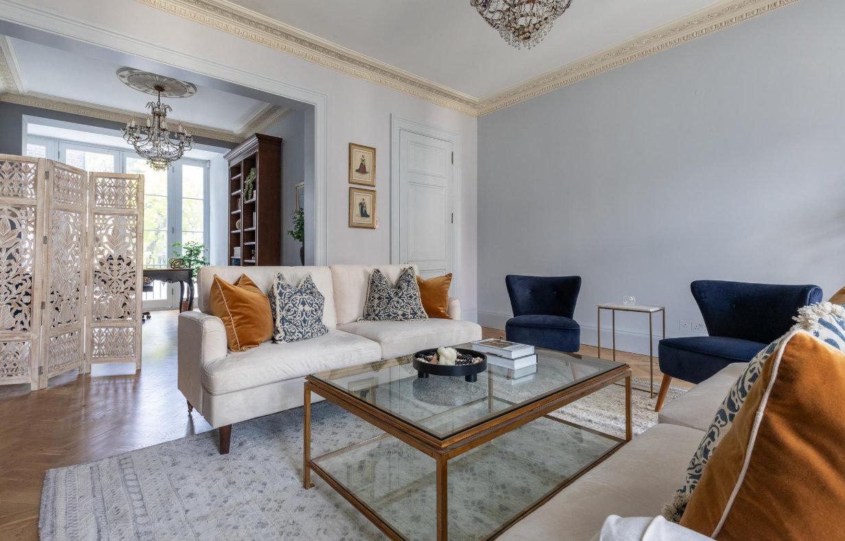 The home itself thoughtfully juxtaposes the original features of the building (such as the ornate cornicing and parquet flooring) with contemporary furnishings and artwork, for a balanced, relaxed feel. The living room is illuminated by floor-to-ceiling windows that fill the room with natural daylight. By contrast, the kitchen is an ultra-modern space with a large skylight and monochromatic décor. The dining room links the two spaces, cleverly combining both vintage and modern elements. The main sitting room dominates the second level, and a piano graces one corner if you re feeling musical.