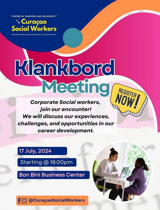 Den luna di yüni 2024 'Curaçao Social Workers' a organisá su promé 'Klankbord Meeting' pa duna oportunidat na trahadónan sosial pa interkambia ku otro. Tabata un atardi plasentero i éksitoso debí ku a logra e meta stipulá. Kada partisipante a kompartí nan opinion riba posibel solushonnan tokante obstákulonan den trabou, pero tambe tokante e formashon di e trahadó sosial mes ku no ta tuma lugá ku frekuensha.