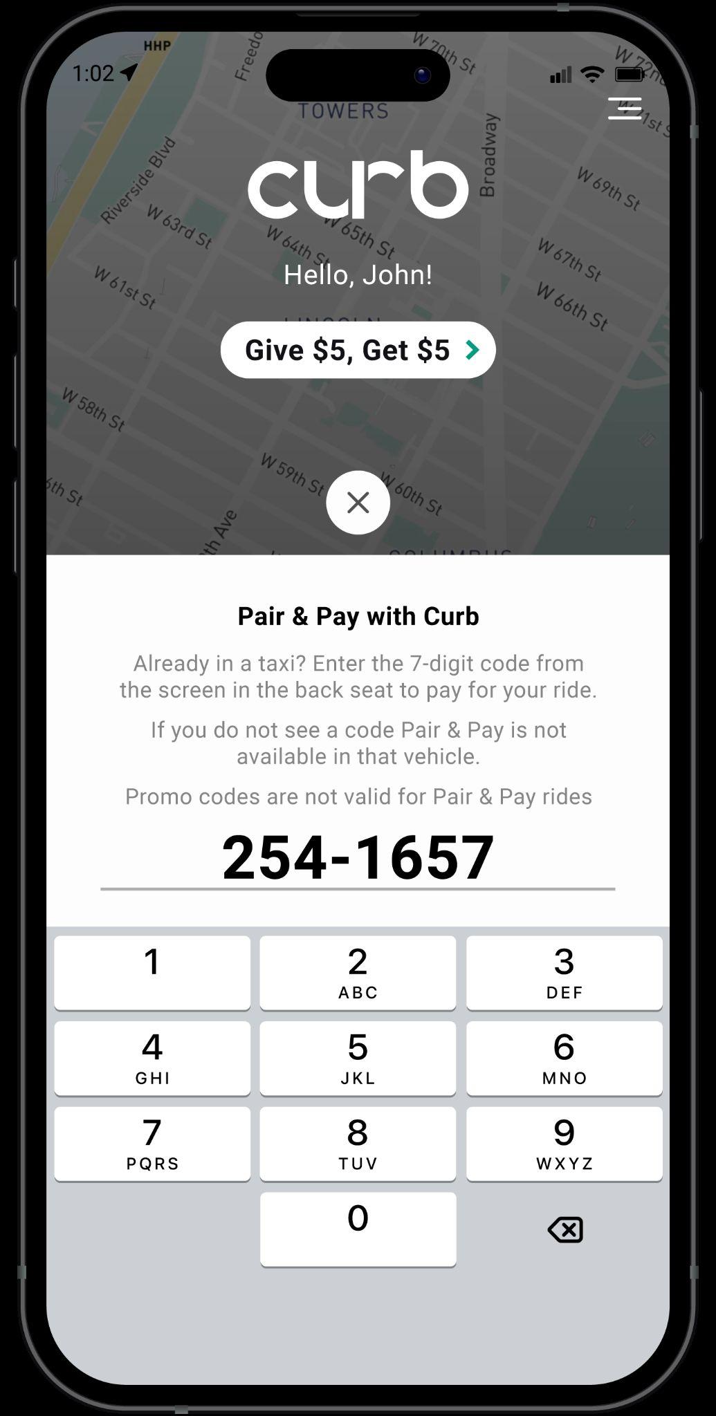 The passenger will enter the Pair & Pay code from the Marquee screen onto their Curb App.
