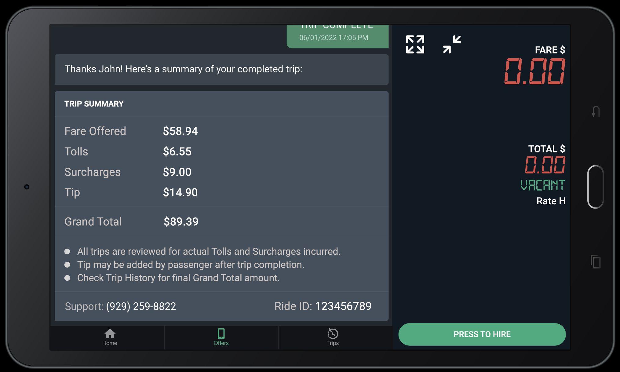 Passenger will receive a text link to download e-Receipt after submitting phone number in the Marquee. The passenger will be able to view the full trip details after tapping the link and downloading.