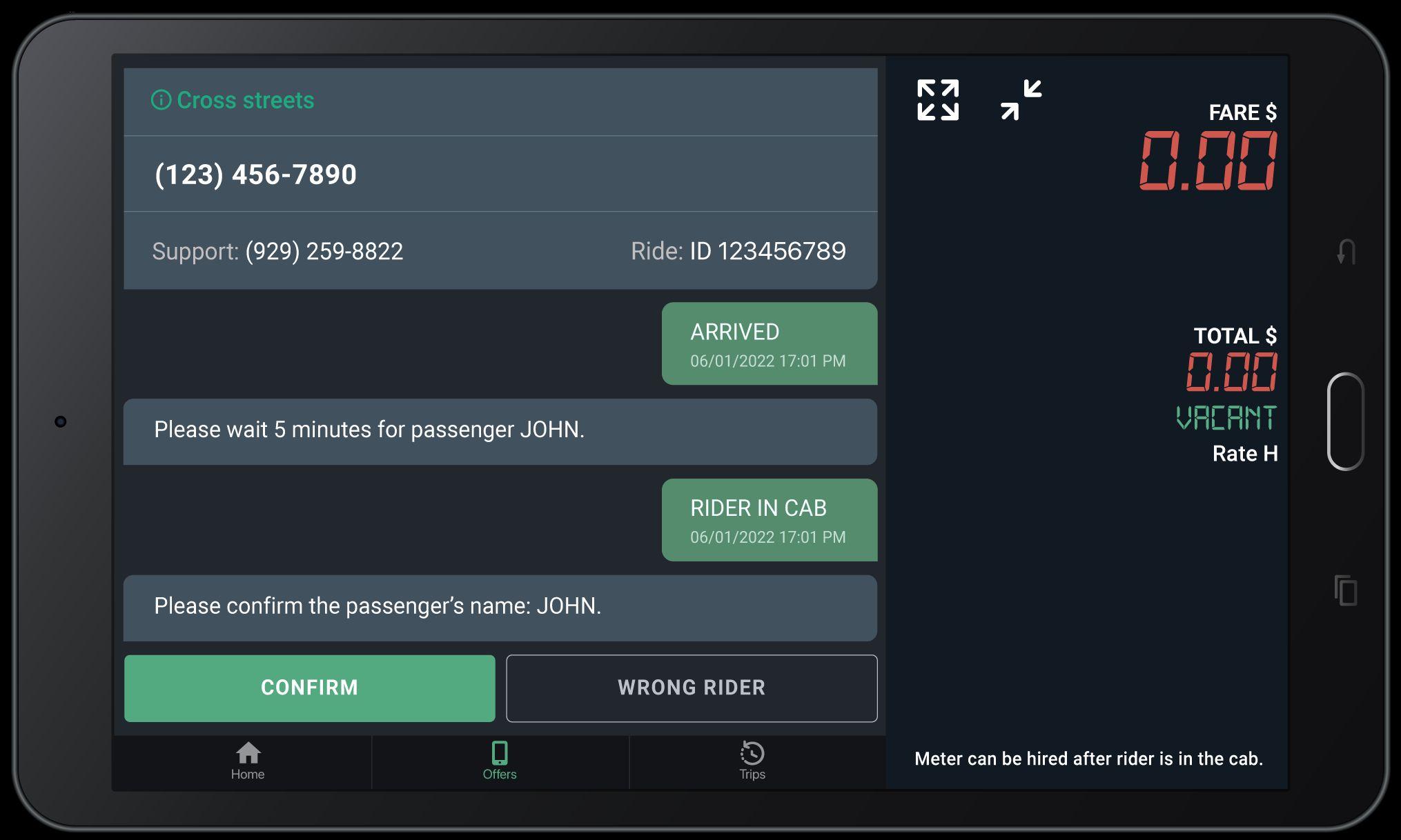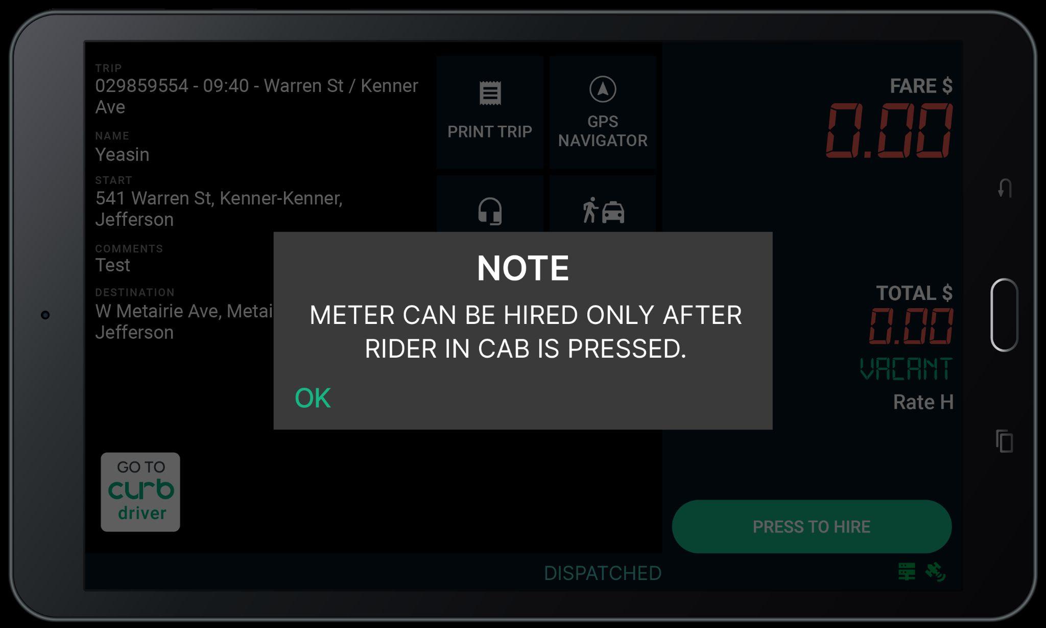 Note: that the meter can only be hired once you are at the pick up location and select Rider in Cab button.