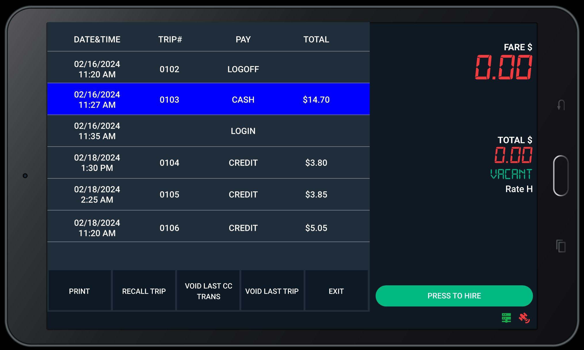 You can now scroll and select individual trips to view details and reprint receipt if needed. This is Vacant Mode
