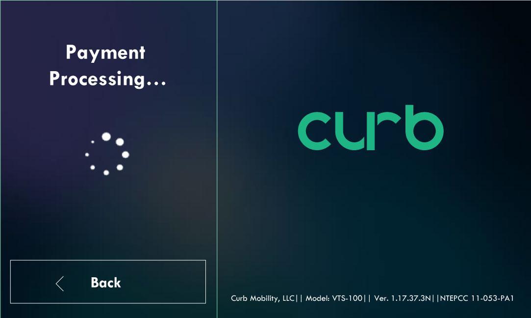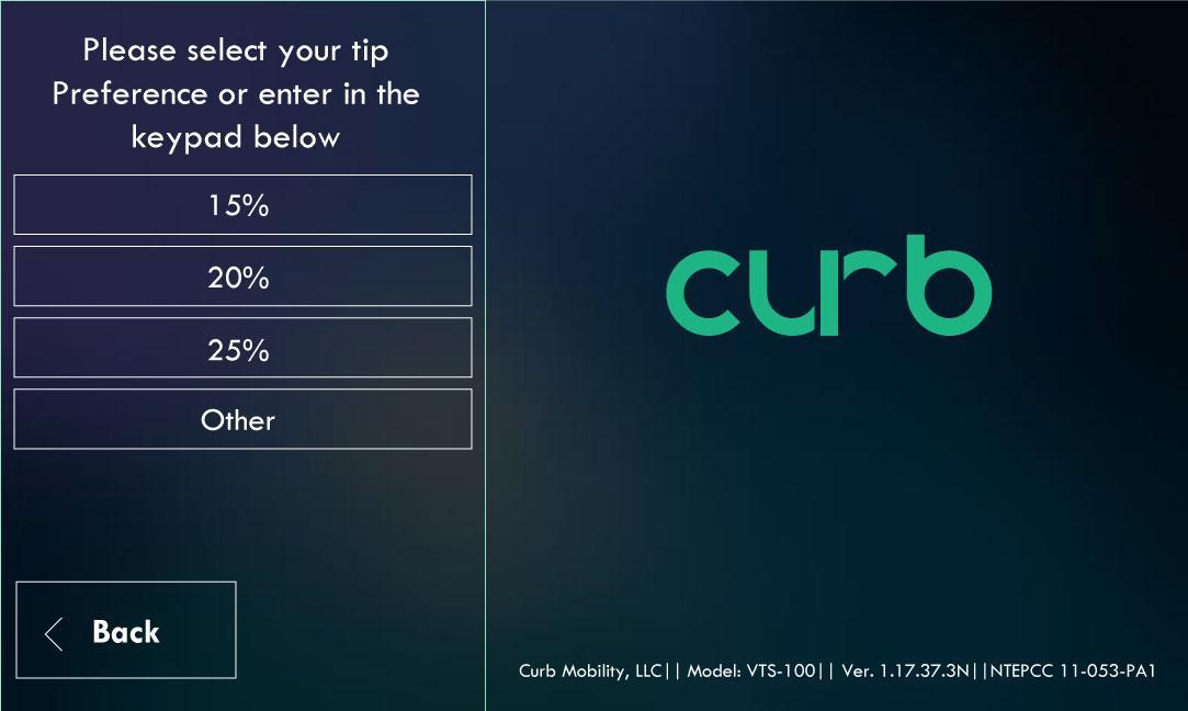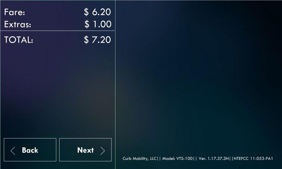 If Passenger selects “Credit” payment method, then will follow to “Next” button to select a Tip amount or “Back” button to change payment method to “Cash”