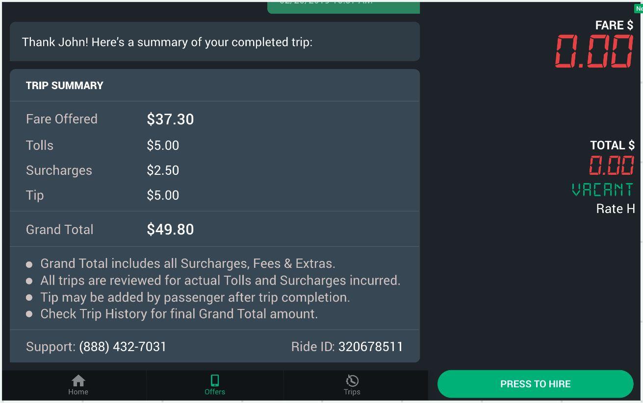 All trips are reviewed for actual Tolls and Surcharges incurred. Check Trip History for final Grand total amount.