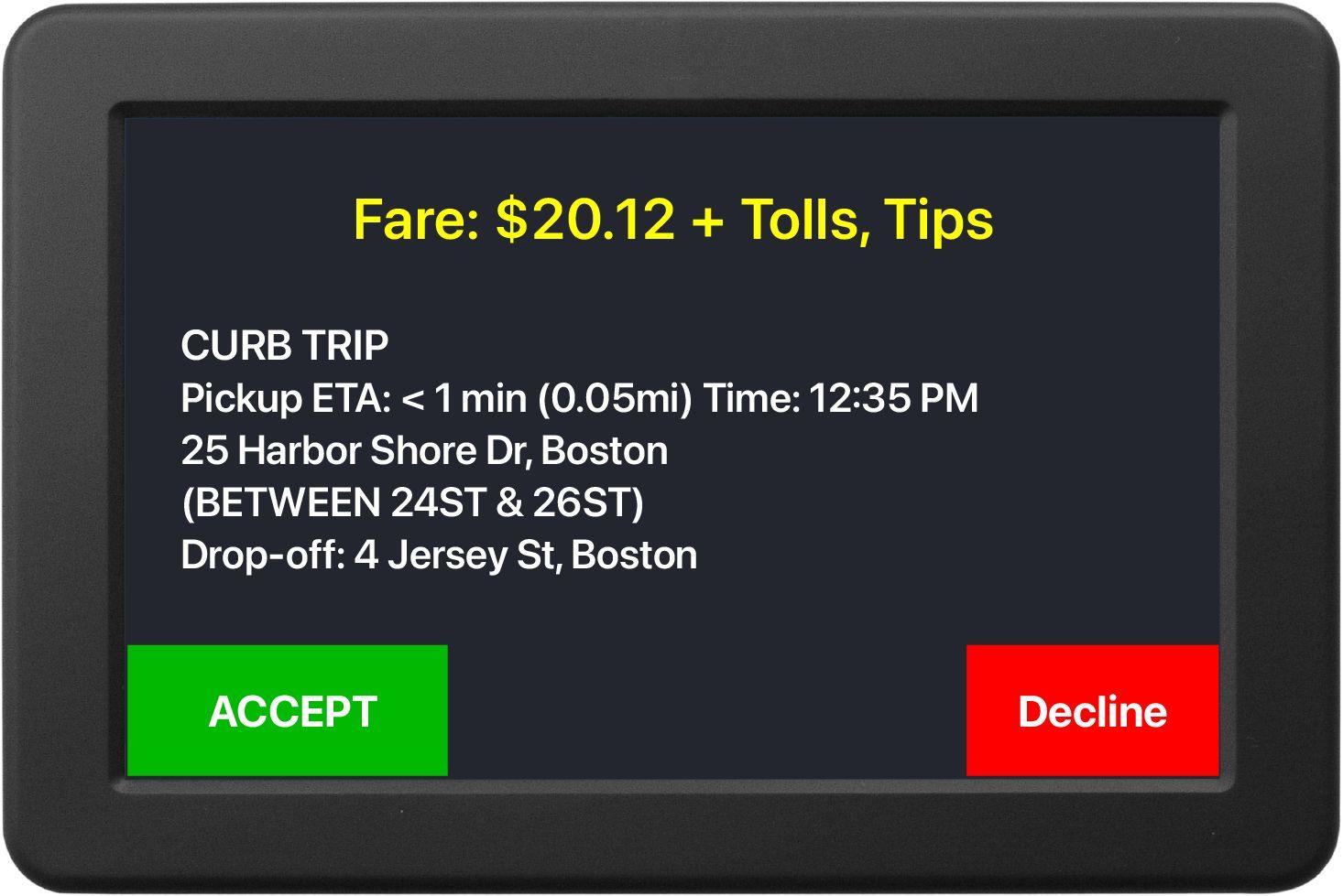 The offer card shows time (min) and distance (mi) to the requested pickup location.