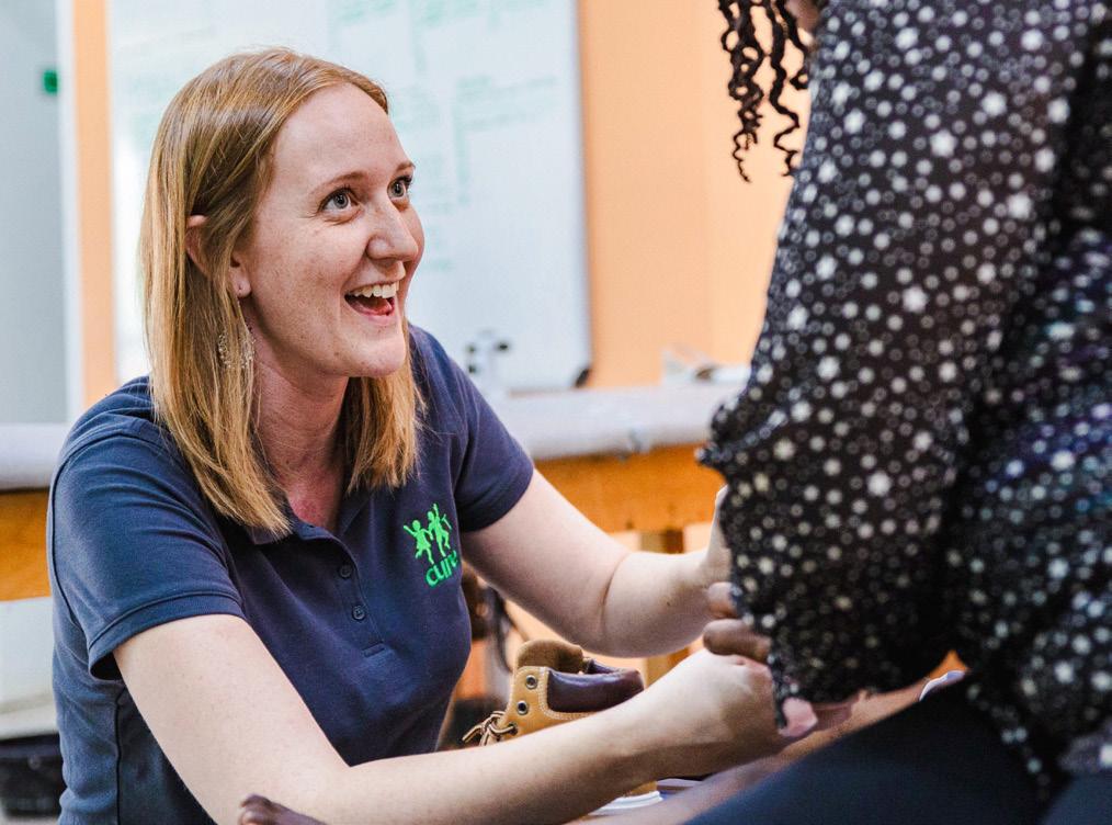 left: Margaret Guyan, CURE’s Director of Prosthetics and Orthotics, examines a child in need of prosthetics.
