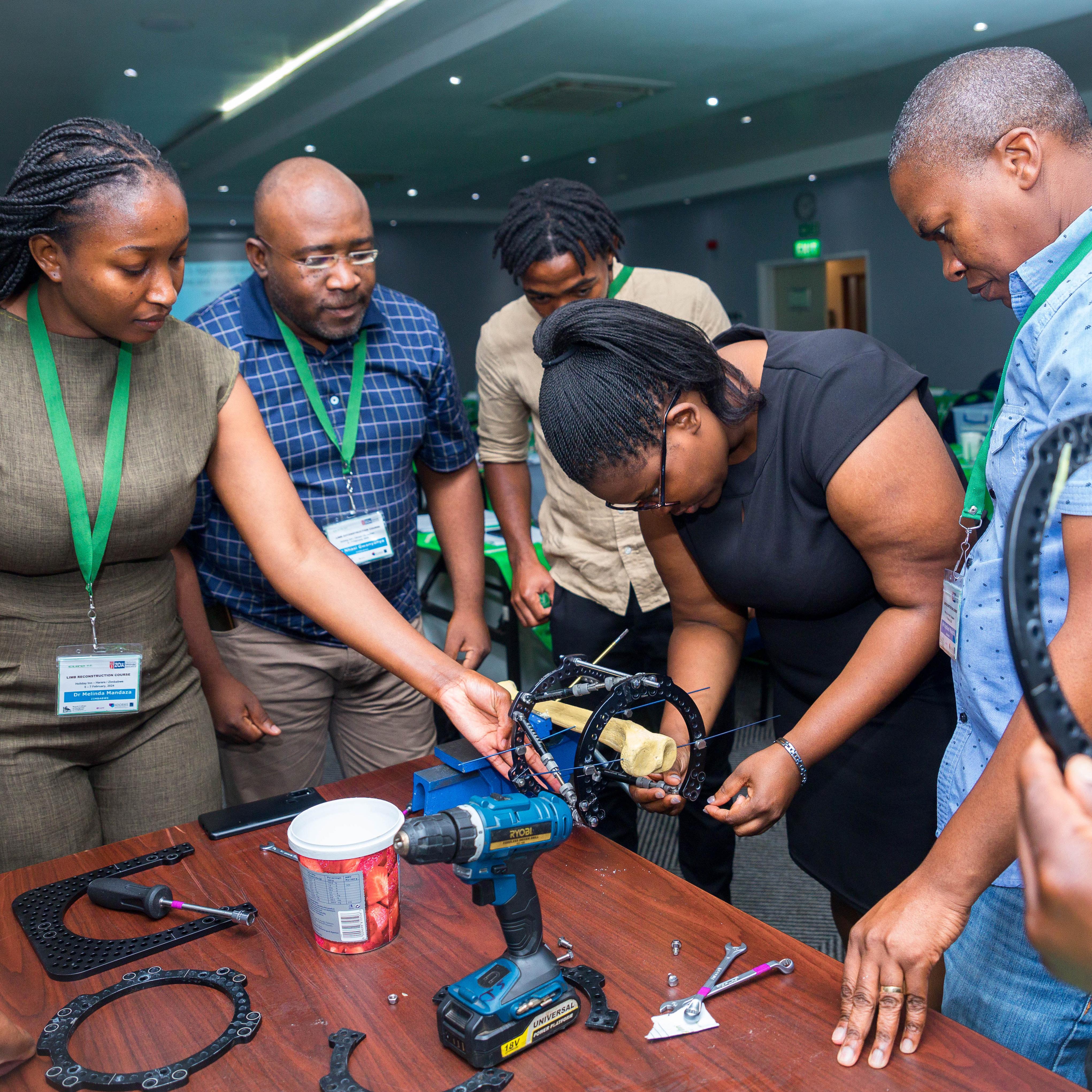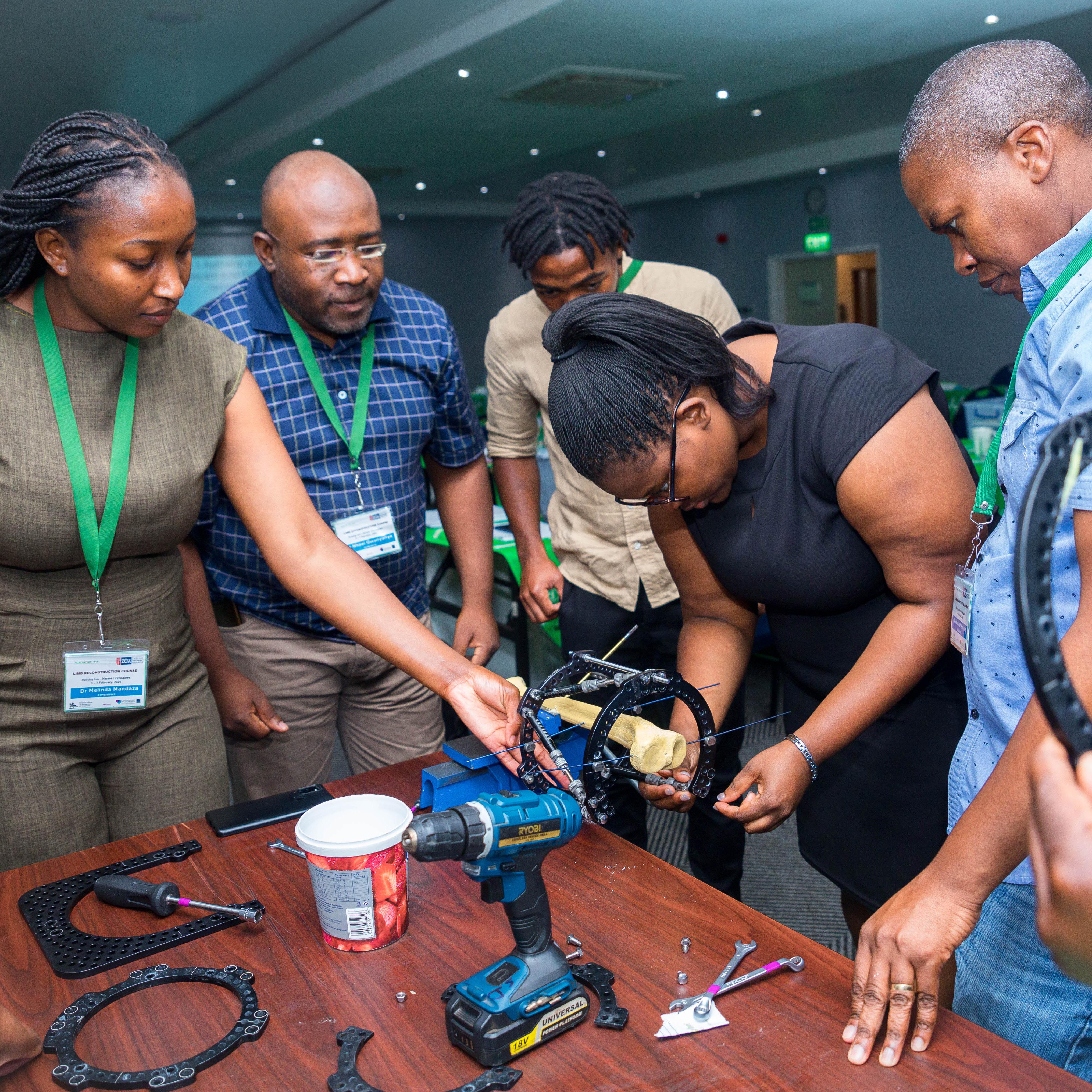 Medical professionals at the training learn to assemble an Ilizarov frame.