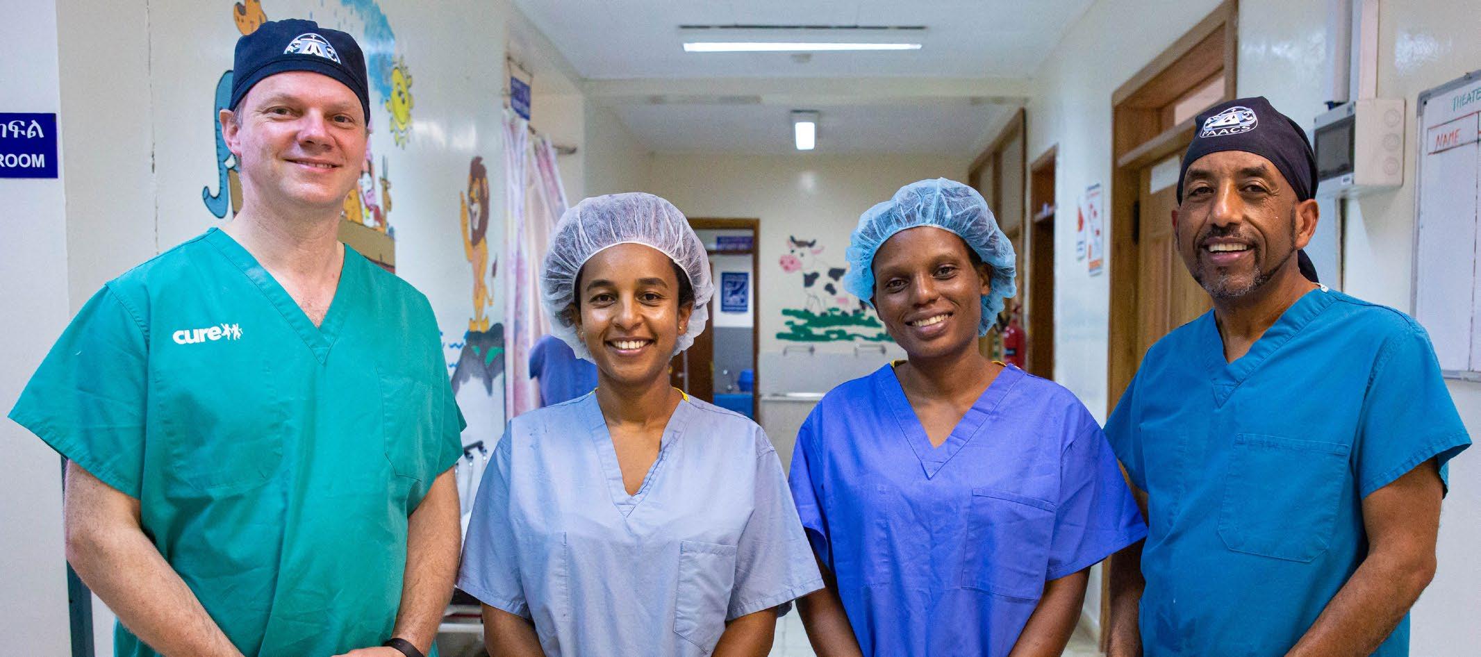 pictured above: the CURE Ethiopia surgical team included (L to R) Dr. Tim Nunn, Medical Director and Orthopedic Surgeon; Dr. Tihut Teshome, Anesthesiologist; Dr. Dorothy Bbaale, Plastic Surgeon; and Dr. Tesfaye Mulat, Plastic Surgeon