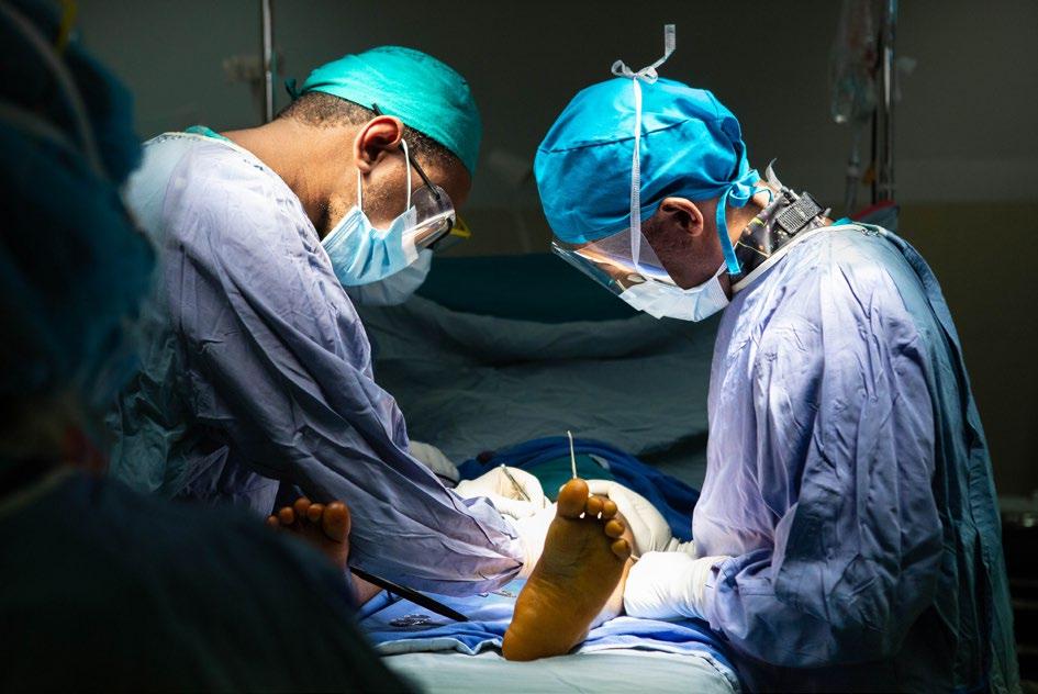 bone. The transplanted bone heals fast, enabling the leg to lengthen and adequate skin cover to areas where the soft tissues are poor. This reconstructive surgery requires trained surgeons, an operating microscope, specialized surgical instruments, and micro-stitches finer than a human hair. Previously, the surgery was performed at CURE Ethiopia by visiting teams of experts from around the world. This case was the first "in-house" microvascular procedure.