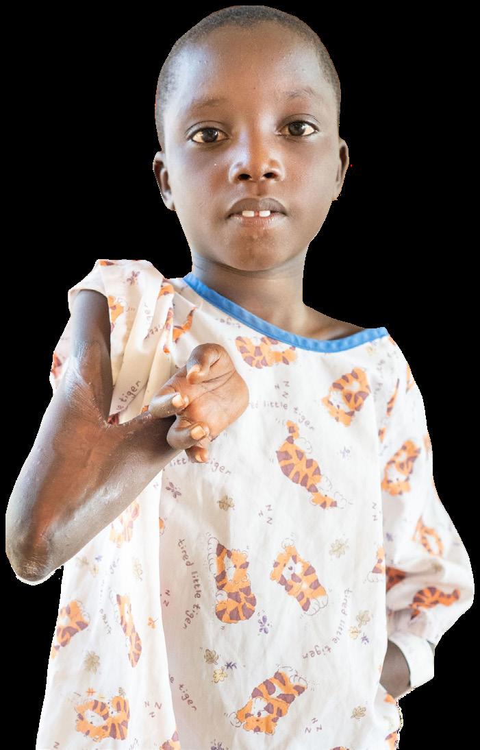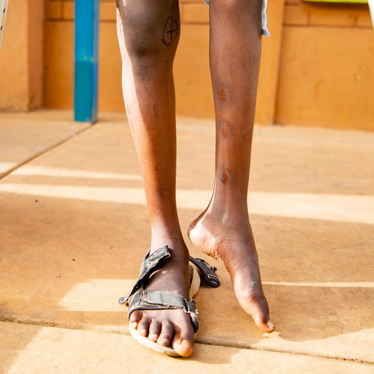 The skin on Mphatso’s right leg fused together after a fire, preventing him from walking and limiting his hope of an independent future.