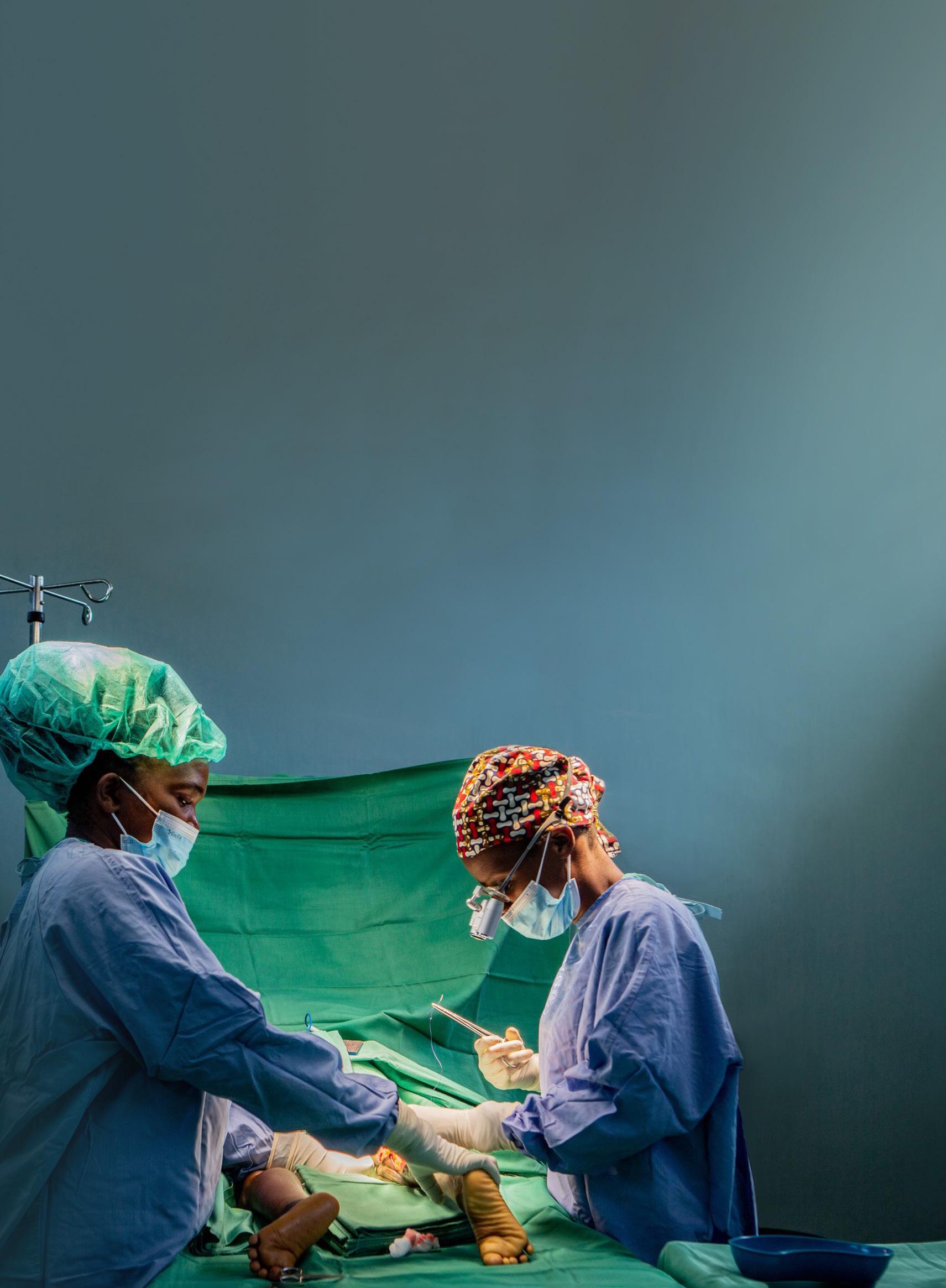 Dr. Dorothy (right) performing surgery on Mphatso's right leg at CURE Malawi.