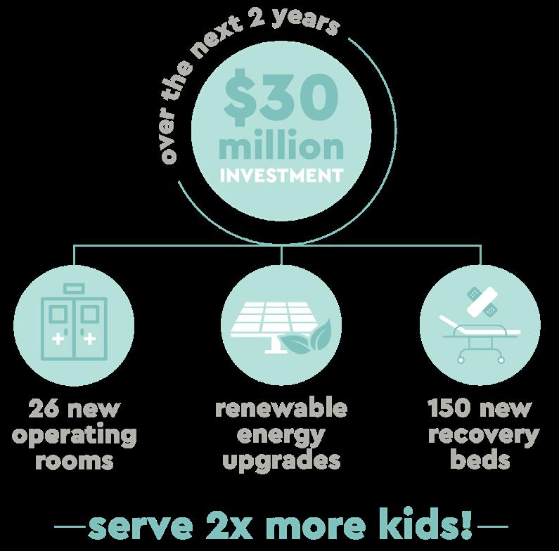 We envision a world where every child, regardless of economic standing, will have access to the life-changing surgical care they need and deserve. Which is why, over the next two years, CURE partners are investing $30M to expand and upgrade our current hospitals so we can serve twice as many children as we do today. These expansions include 26 new operating rooms, an additional 150 recovery beds, and upgrades to our energy infrastructure—including solar power—that help provide steady and affordable energy to power our hospitals.