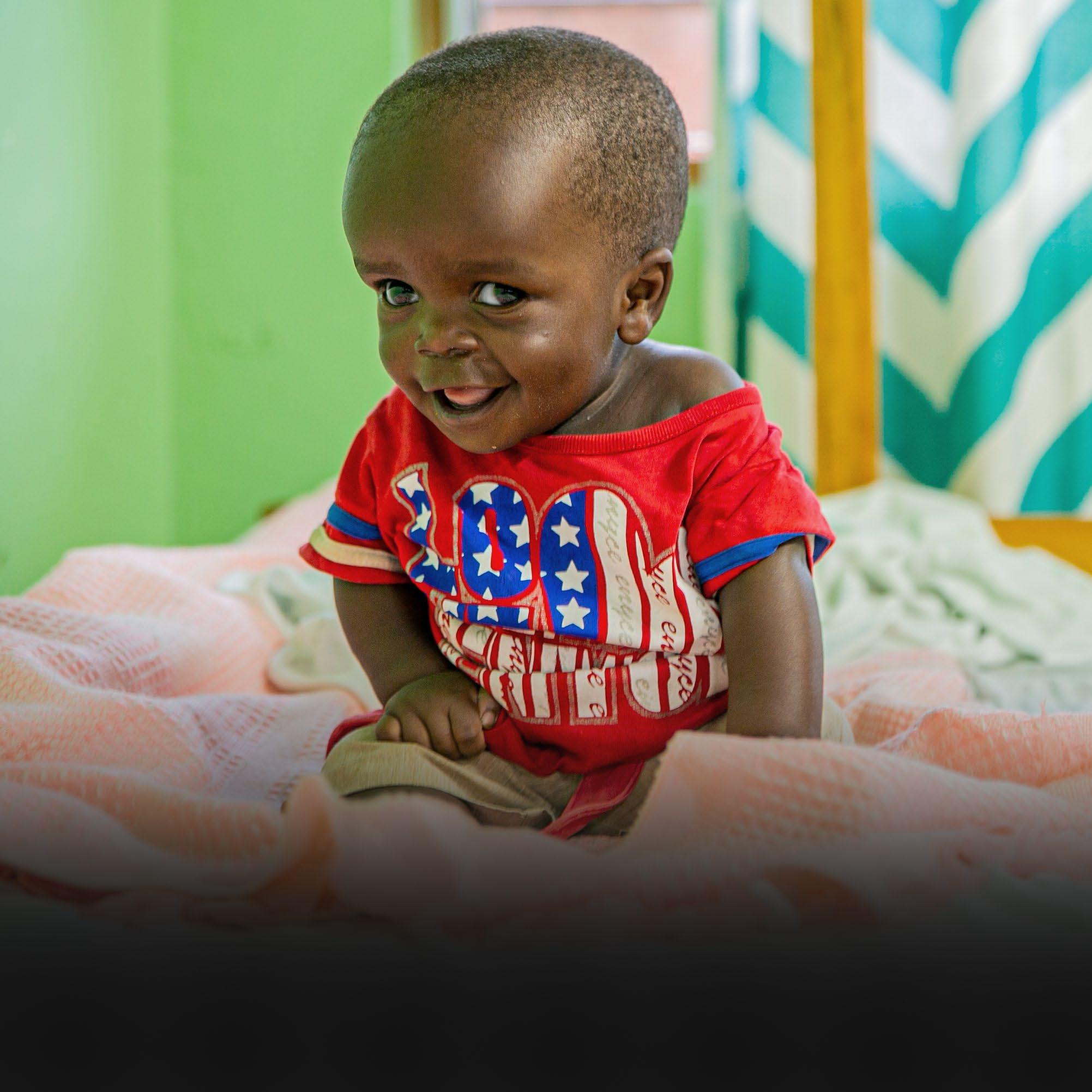 Ezra, treated for hydrocephalus, smiles in the ward at CURE Uganda.