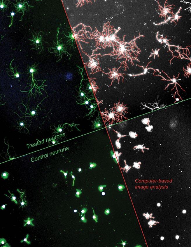 A setup to concurrently image the body and outgrowths of multiple neurons, treated or not (control) with a drug being developed through the BPN Program. Computer-based image analysis allows for visualizaiton, and thus quantification, of new outgrowths following treatment.