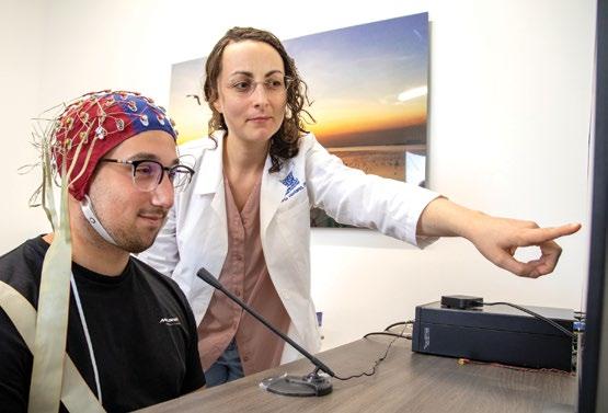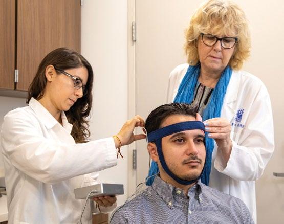 Opposite page top: Researchers prepare a participant for transcranial direct current stimulation