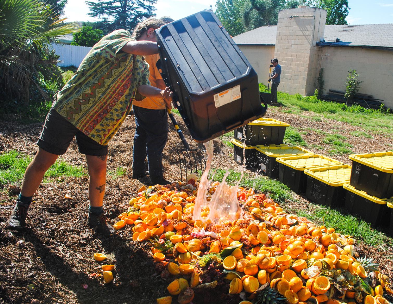 Drew: They really enjoyed the wood chips and throwing them on the pile, because that didn’t smell. But then after that, I came back to Pomona, met up and got the [bike] trailers ready, we went around and picked up all the food waste from the different locations, got here and turned the [compost] piles, we started weighing things, and now we’re kind of caught up to right now. But next, we’re going to finish weighing, build a pile, and we might harvest some stuff from the garden because there’s some stuff that’s ready.
