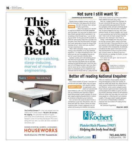 Better off reading National Enquirer Editor, As a recent resident of Carmel, I have been impressed with your paper. While I may not agree with anyone’s opinion, Reader’s view I do appreciate a view which isn’t skewed with liberal dribble (i.e. AP). I was very disappointed that you published some querulous codger’s (David Meisenhelder) virulent verbiage. His assailable vulgarity labeling (Danielle Wilson’s) column as immature is followed by toxic tantrums. He is so lost in the sauce he doesn’t know a commentary is just that. One person’s view. He found fault with Mrs. Wilson’s article not being humorous when it wasn’t supposed to be. He admits not knowing her intention, but quickly