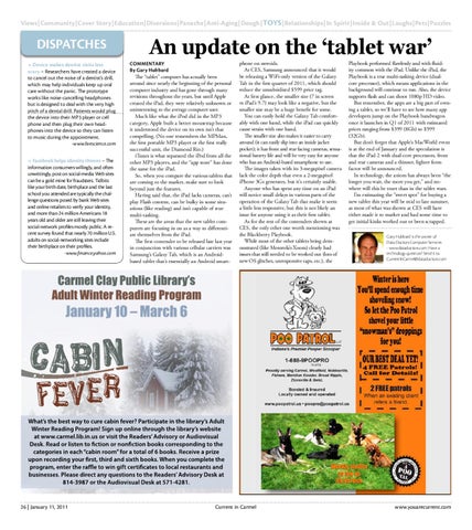 COMMENTARY By Gary Hubbard The “tablet” computer has actually been around since nearly the beginning of the personal computer industry and has gone through many revisions throughout the years, but until Apple created the iPad, they were relatively unknown or uninteresting to the average computer user. Much like what the iPod did in the MP3 category, Apple built a better mousetrap because it understood the device on its own isn’t that compelling. (No one remembers the MPMan, the first portable MP3 player or the first really successful unit, the Diamond Rio.) iTunes is what separated the iPod from all the other MP3 players, and the “app store” has done the same for the iPad. So, when you compare the various tablets that are coming to the market, make sure to look beyond just the features. Having said that, the iPad lacks cameras, can’t play Flash content, can be bulky in some situations (like reading) and isn’t capable of true multi-tasking. These are the areas that the new tablet computers are focusing in on as a way to differentiate themselves from the iPad. The first contender to be released late last year in conjunction with various cellular carriers was Samsung’s Galaxy Tab, which is an Androidbased tablet that’s essentially an Android smart-