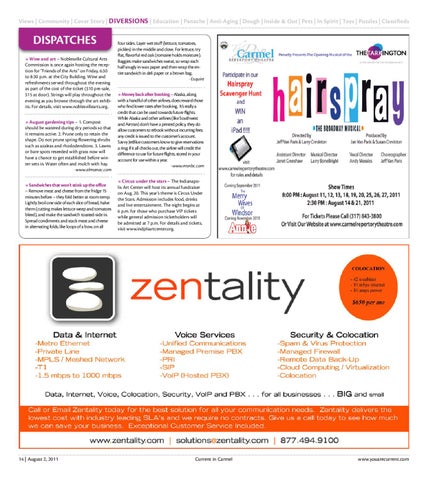 DISPATCHES » Wine and art – Noblesville Cultural Arts Commission is once again hosting the reception for “Friends of the Arts” on Friday, 6:30 to 8:30 p.m. at the City Building. Wine and refreshments served throughout the evening as part of the cost of the ticket ($10 pre-sale, $15 at door). Strings will play throughout the evening as you browse through the art exhibits. For details, visit www.noblesvillearts.org. » August gardening tips – 1. Compost should be watered during dry periods so that it remains active. 2. Prune only to retain the shape. Do not prune spring-flowering shrubs such as azaleas and rhododendrons. 3. Lawns or bare spots reseeded with grass now will have a chance to get established before winter sets in. Water often and mulch with hay. -www.almanac.com » Sandwiches that won’t stink up the office – Remove meat and cheese from the fridge 15 minutes before – they fold better at room temp. Lightly broil one side of each slice of bread, halve them (cutting makes lettuce weep and tomatoes bleed), and make the sandwich toasted-side in. Spread condiments and stack meat and cheese in alternating folds, like loops of a bow, on all