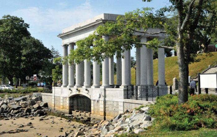 On Nov. 11, 1620, the Mayflower landed near Provincetown. After 41 male passen gers signed the “Mayflower Compact” while still onboard, the passengers disembarked. Because of the harsh winter conditions, most of them went back onto the ship. After three expeditions identified a suitable site for a farming settlement, the Mayflower sailed across Cape Cod Bay, arriving near what is now Plymouth on Dec. 18, 1620. During the following winter, the passen gers lived on the ship, finally going ashore in March 1621. None of the writings of the Mayflower passengers made any reference to going ashore on or near a rock, let alone a specific rock. However, 120 years later, a local resident proclaimed that a 10-ton boulder identified during construction of a wharf in Plymouth Harbor was a literal step ping-stone as the Pilgrims walked ashore. Despite its implausibility, Plymouth resi dents promoted the story and the legend that “the Pilgrims landed on Plymouth Rock” was born.