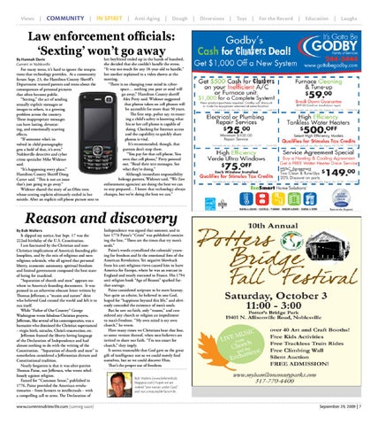Reason and discovery By Bob Walters It slipped my notice, but Sept. 17 was the 222nd birthday of the U.S. Constitution. I am fascinated by the Christian and nonChristian implications of America’s founding philosophies, and by the mix of religious and nonreligious colonials, who all agreed that personal liberty, economic autonomy, spiritual freedom and limited government composed the best stateof-being for mankind. “Separation of church and state” appears nowhere in America’s founding documents. It was penned in an otherwise obscure letter written by Thomas Jefferson; a “reason and nature” deist who believed God created the world and left it to run itself. While “Father of Our Country” George Washington wrote fabulous Christian prayers, Jefferson, like several of his contemporaries, was a humanist who dismissed the Christian supernatural – virgin birth, miracles, Christ’s resurrection, etc. Jefferson framed the liberty-loving language of the Declaration of Independence and had almost nothing to do with the writing of the Constitution. “Separation of church and state” is nonetheless considered a Jeffersonian dictum and Constitutional tradition. Nearly forgotten is that it was uber-patriot Thomas Paine, not Jefferson, who wrote rebelliously against religion. Famed for “Common Sense,” published in 1776, Paine provided the American revolutionaries – from farmers to intellectuals – with a compelling call to arms. The Declaration of