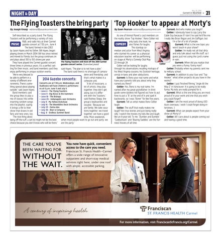 Self-described as a party band, The Flying Toasters will be performing a variety of rock, R&B, and radio hits at their Carmel music gazebo concert at 7:30 p.m., June 4. The band, formed in late 2003 by Jason Hayes and his father, Bill Hayes, began playing shows in March 2004. Bill has since retired and moved to Florida, but the group continues on and plays about 100 to 150 shows per year. The Flying Toasters will kick off the 2014 Carmel They have played the Carmel gazebo concert gazebo concert series. (Submitted photo) three times in previous years. It’s a perfect setting for their music, and band members said they said Hayes. “The plan is to not have a plan.” enjoy performing in unique outdoor events. The band said there’s no shortage of camara“We’re very blessed to derie and friendship, and be able to perform in a that’s what makes it a 2014 Gazebo concerts: variety of different envicohesive unit. Concerts are at 7:30 p.m. Wednesdays, and ronments. There’s some“A lot of musicians, a Ruditoonz will have children’s performancthing special about playing lot of artists, they play es at 6 p.m. June 11 and July 9. outside,” said Jason Hayes. together, they don’t get • June 4 - The Flying Toasters Band members said along, but it’s differ• June 11 - Big Rosco & the Hammers the group likes to play a ent with the Toasters,” • June 18 - The Bishops mix of classic hits while said Rodney Stepp, the • June 25 - Indianapolis Jazz Orchestra inserting random songs group’s keyboardist and • July 9 - My Yellow Rickshaw • July 16 - The Woomblies Rock Orchestra into the playlist, saying vocalist. “Because we • July 23 - Zanna-doo it brings a life to their are family. We take vaca• July 30 - Blair & Company show that draws in old tions together, we travel • Aug. 6 - Endless Summer Band fans and new ones, too. together, we have a good “The nice thing about time. Most weekends, being off-the-cuff, a set list might not be the best when most people want to go out and party, we choice because you don’t know who will be there,” are the party.”