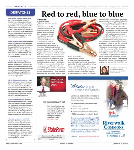 DISPATCHES » Correction: School in session Thursday – The Nov. 9 issue of Current in Westfield incorrectly stated that there is no school for students of Westfield Washington Schools Nov. 18 for parent-teacher conferences and staff development. This is incorrect. These closures are scheduled for Nov. 18, 2011. School will be in session this Thursday. We apologize for any confusion resulting from this inaccuracy. For more information visit www.k12.in.us. » Food drive for Open Doors – Ameriana Bank in Westfield is collecting canned and nonperishable food items to benefit Open Doors, a Westfield-based ministry and food and clothing pantry. The food drive will help those in need this holiday season. Make donations at Ameriana Bank, 3333 East S.R. 32 at Carey Road. Call 867-7740 for more information. » Register for Westfield in Lights – Westfield in Bloom and the Downtown Westfield Neighborhood Association are teaming up to present Westfield in Lights, the city’s first home lighting contest. Three homes will be selected as winners by a panel of judges and recognized by the Westfield Chamber of Commerce. Visit www.dwna.org to register. » Brain Balance names director – Brain Balance Achievement Centers announced that Suzanne Glesing has been named the new center director for the Brain Balance facility in Indianapolis. Brad Ralston will now fulfill the role of executive director for the center. With nearly a decade of experience working with children and families affected by neurological disorders.. » Gray named Role Model - Westfield High School senior Allison Gray is among a new class of student-athletes initiated into an elite group honored by the Indiana High School Athletic Association as IHSAA Role Models. Picking up where those before them left off, these high school students will take the lead as anti-tobacco advocates in their schools and communities. » Vacation auction to benefit kids Would you like to help needy children around the world during this season of giving? Christel House International is hosting an on-line auction for dream vacations where 100 percent of the proceeds benefit the children of Christel House International. The on-line auction will take place from Nov. 22 to Dec. 3. Log on to www.biddingforgood.com/christelhouse to participate in the auction.