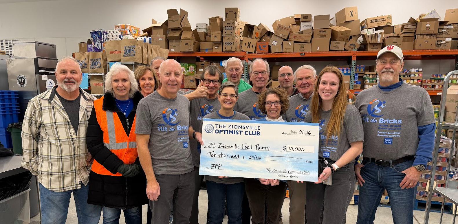 The Zionsville Optimist Club recently donated $10,000 to the Zionsville Food Pantry to support the backpack programs at Zionsville Community Schools. The funds were raised through the club’s 2025 Hit the Bricks 5K. Each year, the Optimist Club chooses an organization to benefit that serves its mission to support children in Zionsville and Boone County. (Photo courtesy of Zionsville Optimist Club)