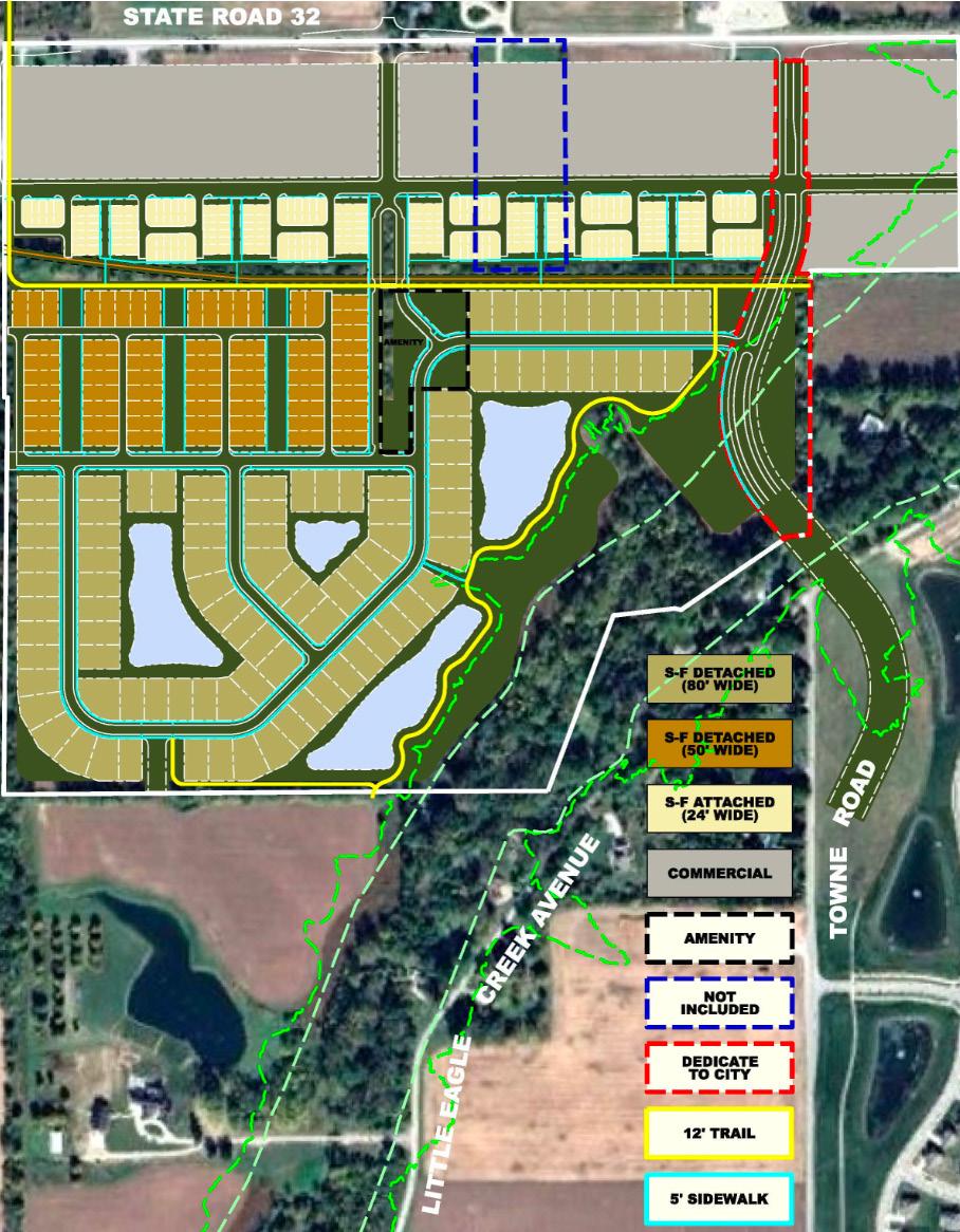 Developer Platinum Properties Management Co., LLC, sought an amendment to update the PUD, originally passed in 2007, to develop 144 acres south of Ind. 32 and west of Little Eagle Creek. The development will include retail businesses along Ind. 32 as well as single-family homes and townhomes directly south of the commercial district.