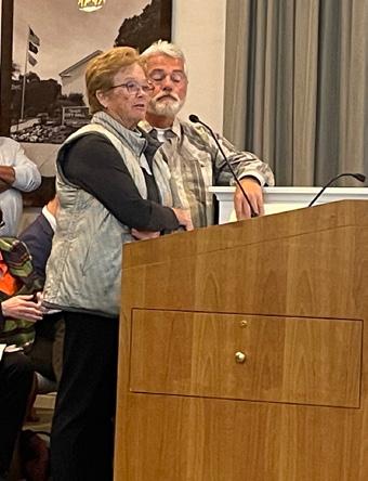 Jane Callahan, joined at the podium by husband Pat Callahan, speaks to the Westfield Advisory Plan Commission during the March 11 public hearing on the Westfield comprehensive plan draft at City Hall.