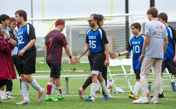 Special Olympics athletes shake hands following a soccer match at the 2024 Eunice Kennedy Shriver Weekend at Grand Park in Westfield.