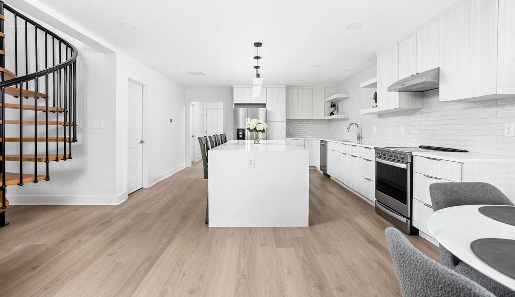 The renovation included replacing a narrow staircase with a sculptural spiral staircase to help maximize floor space,