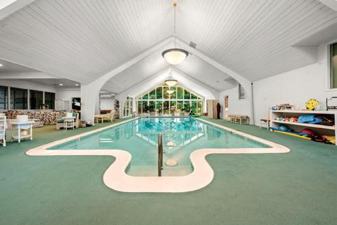An indoor pool complex includes a sauna, game room, full bath, and changing room. There is ample seating all around the pool.